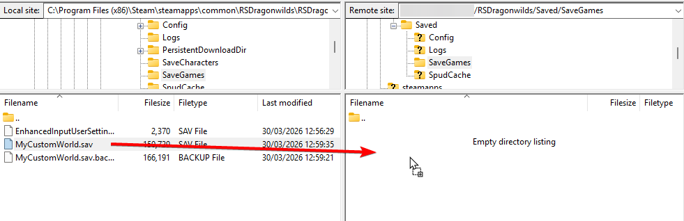 RSDragonwilds/Saved/SaveGamesfolder, it must be empty before uploading your own data - if required, please ensure to backup any data inside this folder that you wish to keep. - Simply drag and drop with your FTP tool to upload the .sav file to your SaveGames folder on the server: